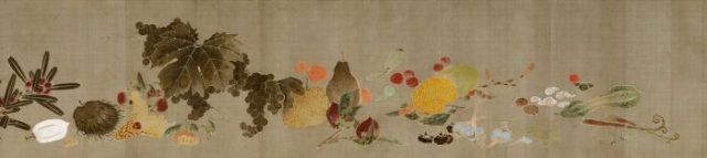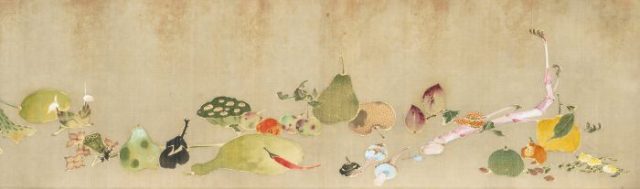 なかでも注目を集めているのは、2023年にヨーロッパでその存在が確認され、コレクション入りを果たした《果蔬図巻》で、約1年間の修理を終えて公開となります。また、《果蔬図巻》の翌年に描かれた重要文化財《菜蟲譜》も並べて公開し、比較してご覧いただく機会を設けます。