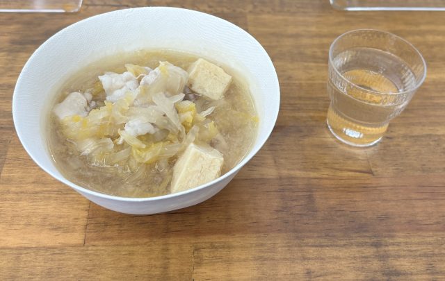 吉春では、日本酒に合う『酸菜スープ』もおすすめ。豚の油と発酵白菜のまろやかな旨みが調和し、おつまみとしても楽しめる。