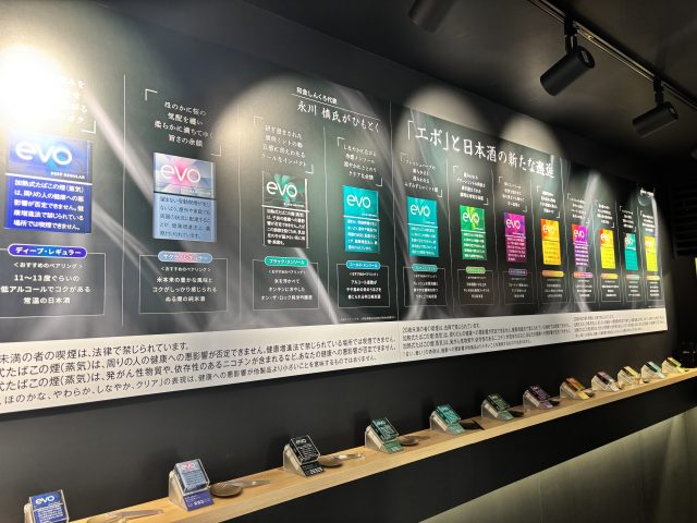 今まで、ウイスキーと葉巻といったように、嗜好品同士のペアリングはありましたが、加熱式たばこと日本酒を合わせるのは新しい。ズラリと並ぶエボのフレーバーを見ると、マンゴーやバナナ、ベリーといったなど日本酒に通じる香りの要素を持つものも多いです。これを永川さんはお酒につなげています。例えば、フルーティなフレーバーを持つエボなら、華やかな香りを持つ吟醸系、メンソール系ならミントの爽快感を引き立てる辛口の日本酒、といったように互いに響き合う組み合わせを、ロジカルかつ感覚的に提案しています。