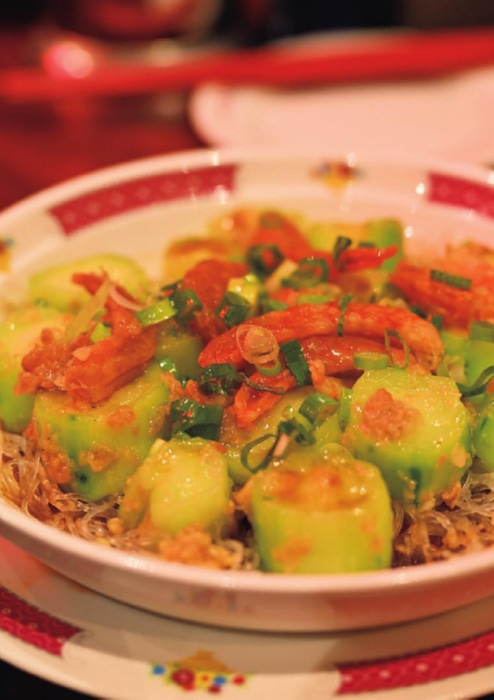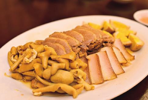 広東料理のひとつ、潮州(ちょうしゅう)料理は潮州市や汕頭(スワトウ)市の料理を指す。干した牡蠣や魚介の乾物、魚の浮き袋など海産物のだしを巧みに使い、広東料理のなかでも、繊細で滋味ある味わいが特徴だ。『樂口福酒家』はガチョウ料理も名物で、内臓肉とともに滷水(ルウスイ)という醬油と酒、砂糖に八角を加えたスープで煮込む。よく煮込まれたガチョウのスライスはやわらかく歯切れもよい。内臓もしっとりと旨みを蓄え、辛すぎず甘すぎず、絶妙な味わいだ。