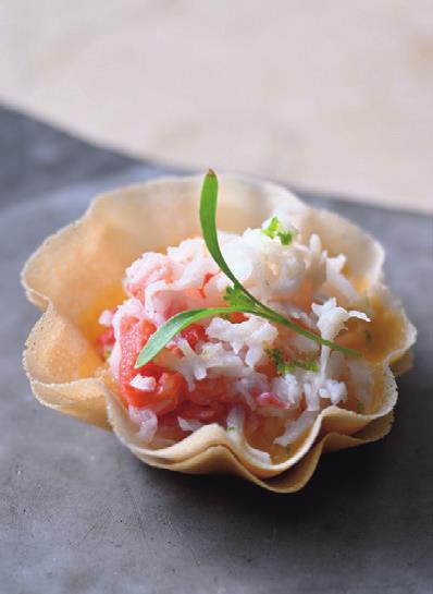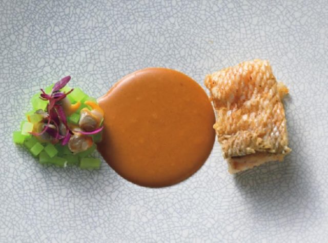 「低温調理やオーブン焼きなどフランス料理の技術に中華の技法と調味料、香辛料やハーブを組み合わせることで、従来にはない食感や風味の体験をしてほしい」と語る。たとえば、ベシャメルソースにオイスターソースを合わせるとコクが増し、海鮮や野菜との相性が高くなる。甘鯛の松笠焼きには甜麺醬(テンメンジャン)を生かしたフランス料理のソースをあしらい、和食の技法に中華とフレンチを融合させた。
