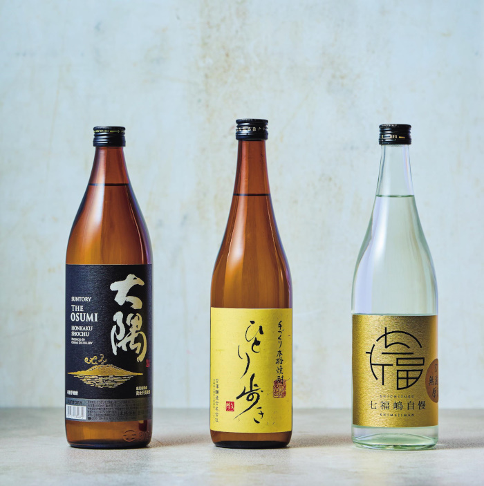 写真右から:七福嶋自慢、ひとり歩き、サントリー本格焼酎 大隅〈芋〉。