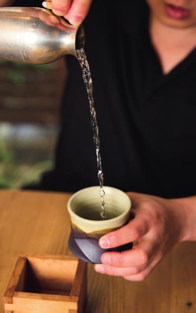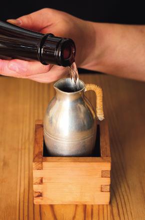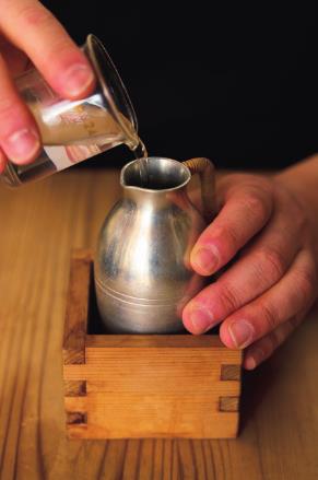 ちろりを高く持ち上げて、焼酎を空気に触れさせるようにして、お猪口に注ぐ。このように、“お燗タージュ”すると、焼酎の香りがよく立って、よりまろやかな味になる。燗冷ましになってもおいしい。