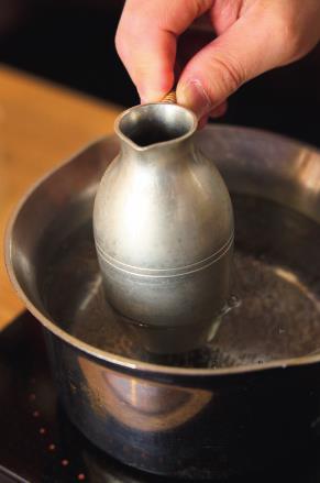 鍋に湯を沸かし、沸騰したら中火にして、ちろりを浸す。30秒〜1分ほどで引き上げて味見をする。ちょっと熱いなと思うくらい(70℃)まで温める。