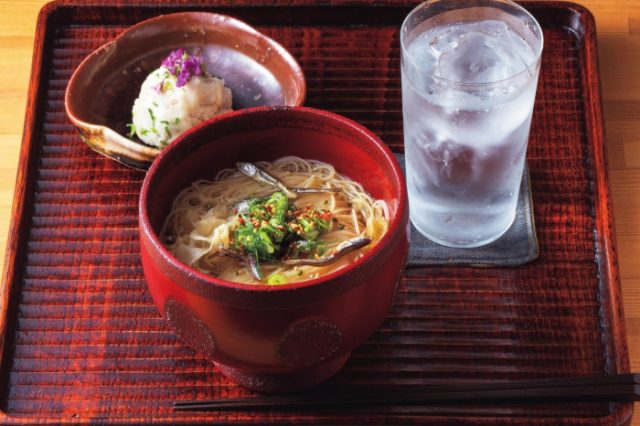 献立には、麦、米、芋、黒糖、泡盛と25種を超える焼酎が並ぶ。前割り焼酎も常備。愛は料理にも伝播して、奄美風そうめんは奄美の富田酒造場を訪ねた際に教わったレシピがベースで、オリーブオイルと煮干しで仕上げる。夜鳴きそうめんとして人気が高い。