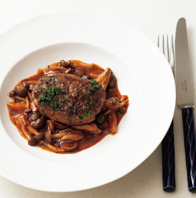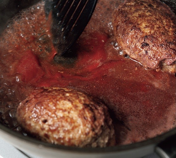 僕の料理の原点ともいうべきハンバーグを紹介します。まずは軽い煮込み仕立て。ケチャップベースの甘ずっぱいソースにバターでコクを加えた家庭の味です。肉を手早く練ってふわっとさせ、しっかり焼きつけることでうまみを引き出しましょう。