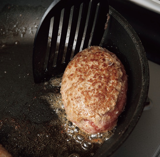 混ぜているうちに脂が溶けたら冷やすと◎。フライパンの側面を使って形よく焼き上げる。