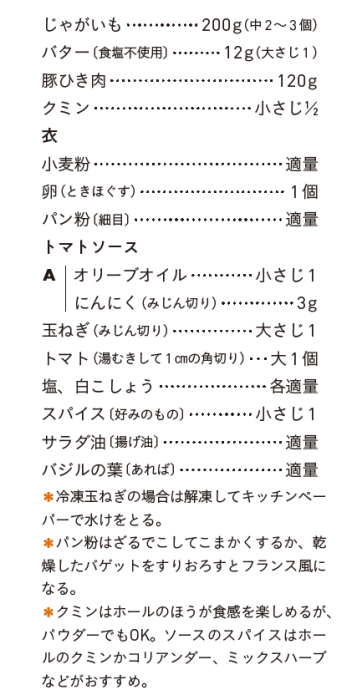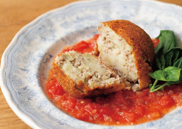 いつものポテトコロッケも、形を変えればがらりと印象が変わります。スパイスを効かせたトマトソースを敷いて、おしゃれなひと皿に。バジルなどのグリーンを添えて目にも鮮やかに仕上げましょう。