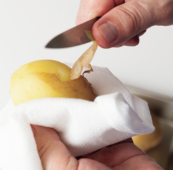 1.じゃがいもはまるごと蒸し、熱いうちに皮をむく。