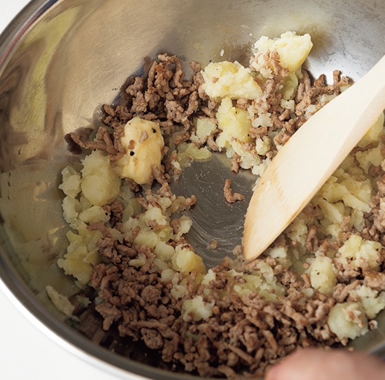 2.フライパンを強火で熱し、ひき肉を炒める。火が通ったら塩、こしょう(各ひとつまみ)し、クミンを加え、火