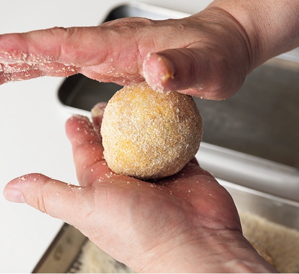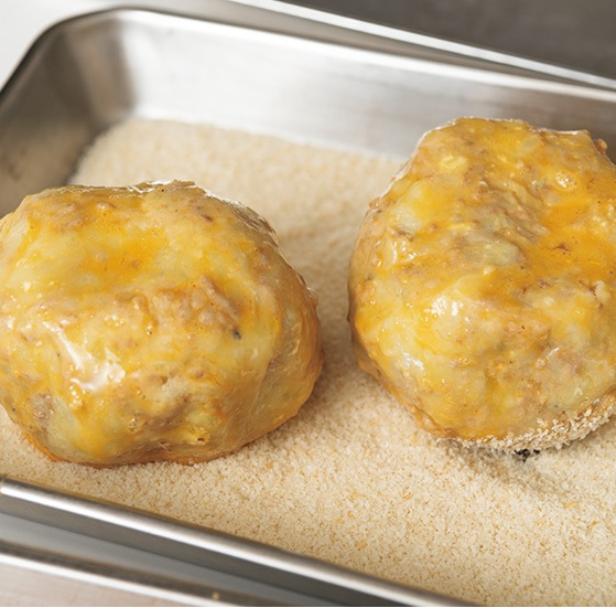小麦粉、卵、パン粉の順に衣をつけ、丸く成形する。