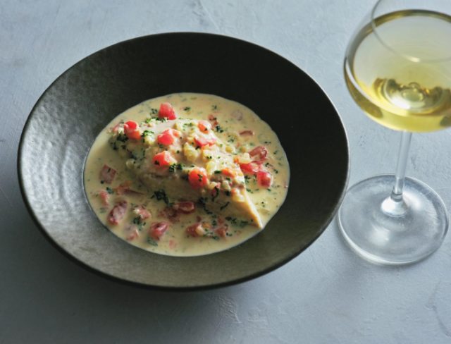 白ワインを飲みながらつまみたい「白身魚のソース デュグレレ」は、白ワインと生クリームを使った軽い煮込み。魚は切り身を使い、味付けは塩のみ。フライパンひとつでできると言う気軽さだが、まるでレストランのような深い旨味と酸味の効いたソースに驚く。