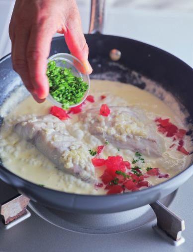3.生クリームを加え、軽く揺すって馴染ませたら、魚の切り身を入れる。蓋をし3〜5分ほど煮る。蓋を取り、煮汁がトロっとなるまで煮詰める。塩、胡椒で味を調え、仕上げにトマトとパセリを加える。