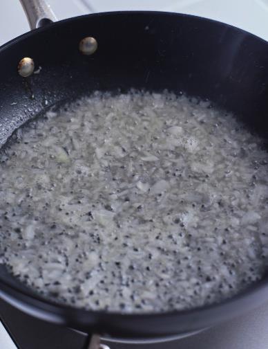2.フライパンに油と玉ねぎを入れ、弱めの中火にかけ、色づけないようにしんなりするまで2〜3分炒める。ワインを加えて中火にし、半量になるまで煮詰めて、旨味をしっかり凝縮させる。