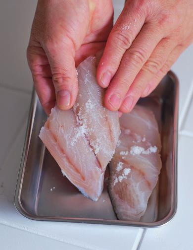 1.白身魚は塩小さじ1/2を振って、手でよく摺り込み5分置く。流水でさっと洗い流し、ペーパーで水分を取って、軽く胡椒を振る。トマトは横半分に切って種を取り、5mm角に切る。