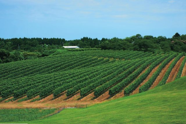 能登の丘に広がる美しい畑でぶどうを丹念に育てる
