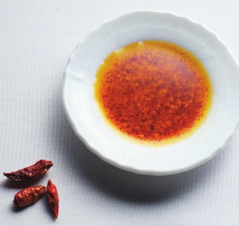 赤唐辛子1:オリーブ油10の割合で、ハンドブレンダーなどでかくはんする。赤唐辛子の辛みを余すことなく使え、オイルの量で辛みを加減できる。赤唐辛子1本で代用可。その場合は2(↓)の工程で加え、ゆっくり火を通す。