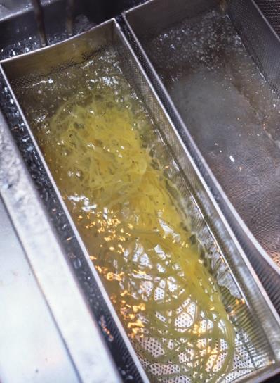 まずソースのベースづくり。にんにくの香りを最大限活用するためみじん切りにして、辛みの素となる唐辛子オイルとともに炒める。ここで注意するのは、焦がすとソースに苦みが出るので、弱火でじっくり火を通すことだ。そして焦げる一歩手前でトマトの水煮を投入。縁についたソースは旨みになるのでこそぎ落とし、3分ほど煮る。塩での味付けも、煮込みも必要なし。ソースの色が赤から明るいオレンジ色に変わったら、ほどよい酸味が残るソースの完成だ。