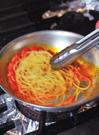 トマトソースの場合、パスタは少し固めにゆでて、大らかに湯きりをするとパスタがソースをはじき、食べ終わるまで軽やかな状態が続くと小倉シェフ。心地いい辛さがクセになるおいしさだ。