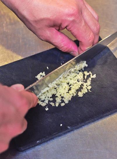 にんにくはみじん切りにする。これにより、ソースにしっかり香りが移り、パンチのある味に仕上がる。