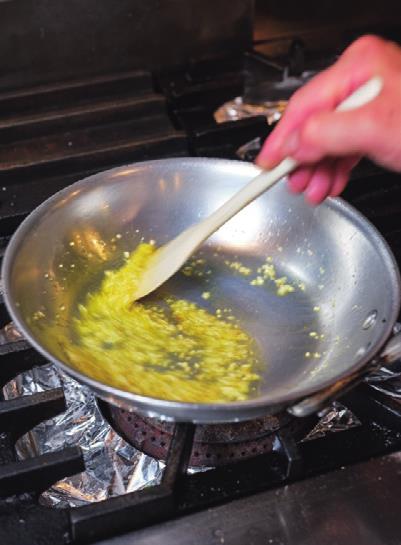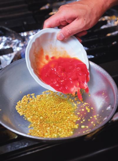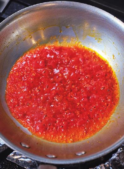 中火にし、縁についたソースをこそげながら絶えず混ぜて、ソースの色が赤から明るいオレンジ色になるまで約3分間火を通す。