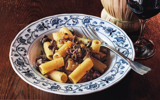 香味野菜と合わせて約30分煮込むとラグーの完成だ。力強い肉のソースには、弾力のあるパスタが定番。ぜひ赤ワインと一緒に。