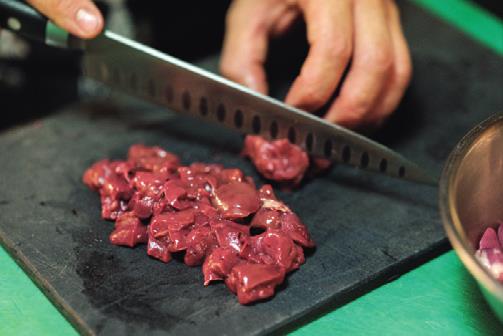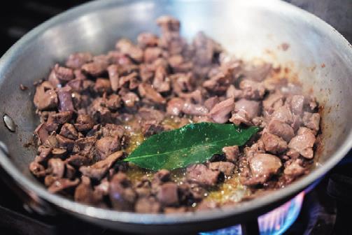 肝心なのがレバーの下処理。独特なクセが取れて、旨みとねっとりした食感が際立つ。炒めるオイルににんにくとローズマリーの香りをしっかりつけるのも、レバーを風味よく仕上げるためだ。