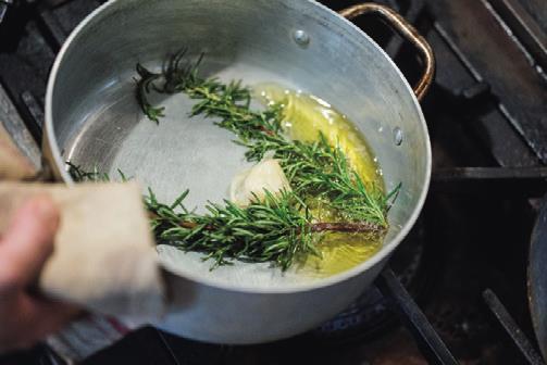 2.厚手の鍋にオリーブ油を鍋底に広がるまで注ぎ、にんにくとローズマリーを入れる。弱火にかけてじっくり火を通し、香りがたったらローズマリーを取り出す。