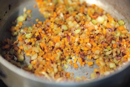 3.オリーブ油の半量をボウルに移して取っておく。赤玉ねぎ、にんじん、セロリ、塩1つまみを加え、カリカリになるまで炒める。