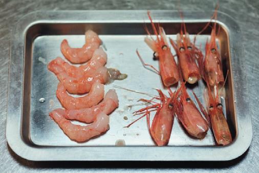 甘海老はヒゲを除き、頭を切り離す。殻と尾を取り除き、背に切り込みを入れて背ワタを取り、長さを半分に切る。