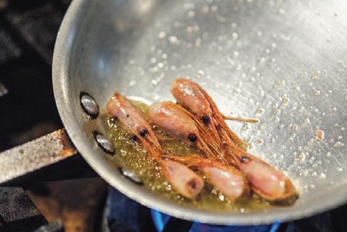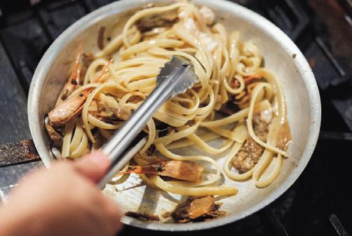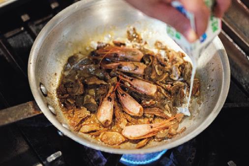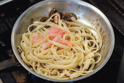 今回のレシピは、有頭の甘海老とポルチーニ(茸)を用いてつくる。ポルチーニは乾燥を戻して使用。香りの強いポルチーニに負けないように、海老は頭をカリカリに焼きつけ、香ばしさと上品な旨みをオイルに移す。合わさることで、ソースの香りと旨みがますます高まる。仕上げに少量の生クリームを加えるのはコク出しのためだ。パスタと海老の身を投入したら、海老の甘みを生かすため、火を入れすぎないように手早く混ぜ合わせれば完成となる。