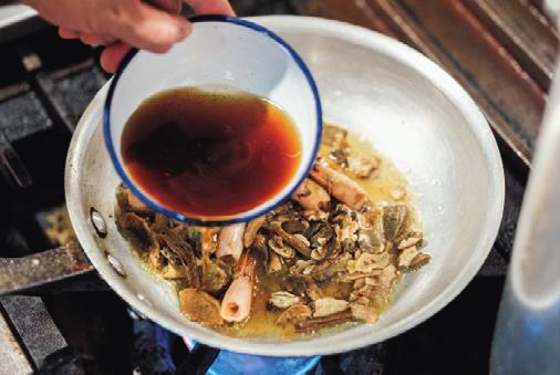 ポルチーニを加えて塩2つまみをふり、サッと炒める。戻し汁を注ぎ、軽く煮詰める。