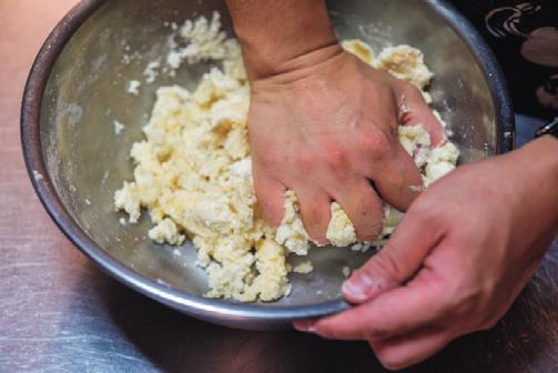 2.粗熱が取れたら小麦粉と塩を加えて全体を混ぜ合わせ、溶き卵を加えて生地をつかむようにしながら、よくこねる。あらかたまとまってきたら、手のひらで押すようにこねる。