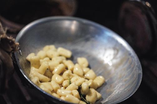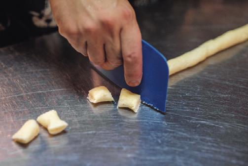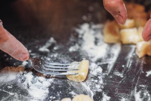 ニョッキのつくり方は大らかだ。気を配るのは、生地に入れるじゃがいもが水っぽくならないように皮ごと蒸し、熱いうちにしっかりつぶすことと、生地は耳たぶの固さになるまでこねること。ハイライトはフォークで線をつけるところ。ソースがからみやすくなり、この時点ですでにおいしそうだ。