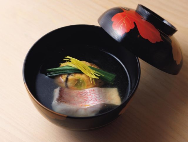 自家製の飛龍頭とぐじを椀種に、ほうれん草と黄柚子を添えた「飛龍頭とぐじのお椀」2500円。