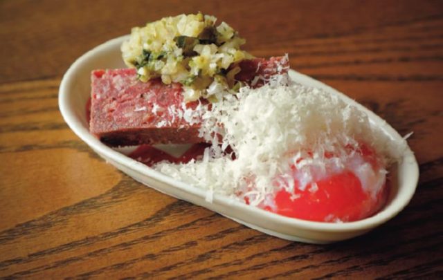 気軽とはいえ、料理は本店で仕込むから、材料や味はそのまま。ひとりでも食べきれる量を小皿に盛って供する。多くの客が注文する「熊パテ」には、卵黄とチーズが添えられ、タルタルステーキのように崩して食べるのがお薦めだ。的確な処理を施し調理されているから、嫌な野性味は一切ない。