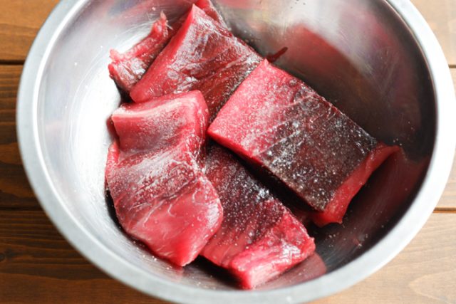 今回使用したまぐろのあらはめばちまぐろで、100gあたり50円。同じめばちまぐろの刺身用柵は100gあたり399円だったので、とてもお得です。まぐろのあらは鯛や鮭のあらと違い、ほとんどの部分を食べられ、少し火を通すだけで筋も気になりません。