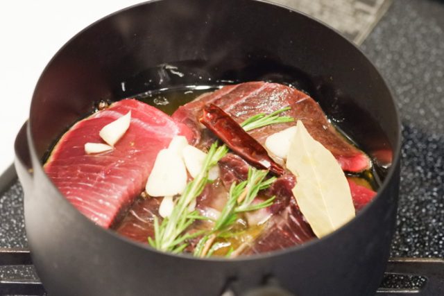 鍋は直径の小さいものを使うと、オリーブオイルの使用量を抑えられます。保存時はオリーブオイルにしっかり漬けてパサつきを防ぎ、1週間を目安に食べきりましょう。