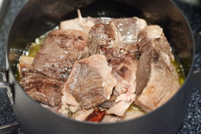 2.1を水で洗い流し、水が濁らなくなったらキッチンペーパーで水気をふき取り、鍋に入れる。★の調味料を加え、オリーブオイルをまぐろが半分以上浸かる量加える。
