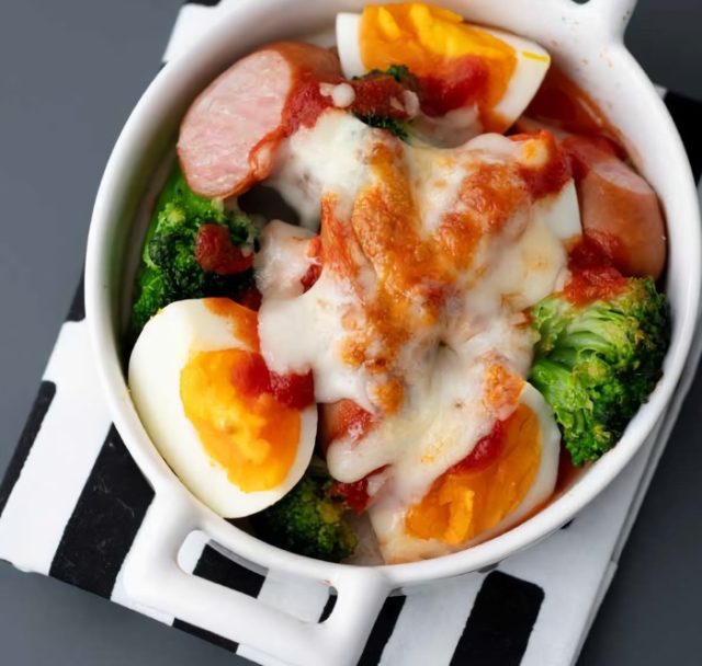 トマトソース缶で作る「ゆで卵とソーセージのグラタン」
