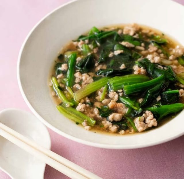 豆板醤やラー油で辛味を足しても◎「ひき肉とほうれん草のオイスター煮」