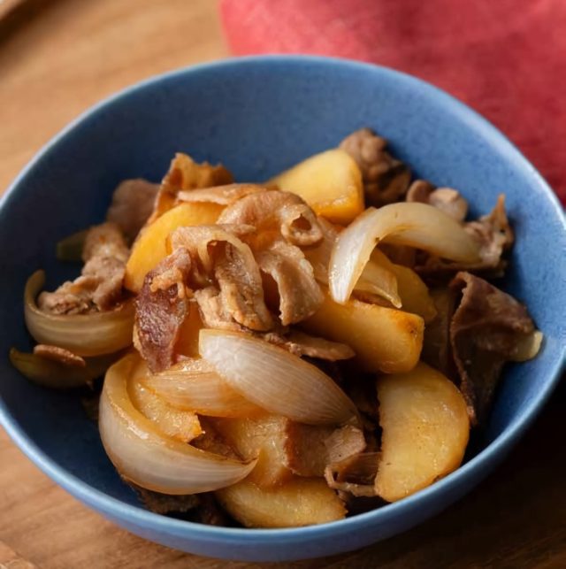 (2)フライパンにサラダ油を中火で熱し、豚肉をいためる。色が変わったら玉ねぎを加えていため、しんなりしたらAを加えて煮立たせる。
