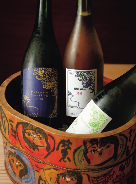 奈良の農家が栽培したデラウェアや五條市のシャインマスカットなどを原料に醸す「木谷ワイン」。鹿のエチケットにも奈良愛が表れる。ワインクーラーは東大寺の住職、清水公照氏が絵付けした木桶。