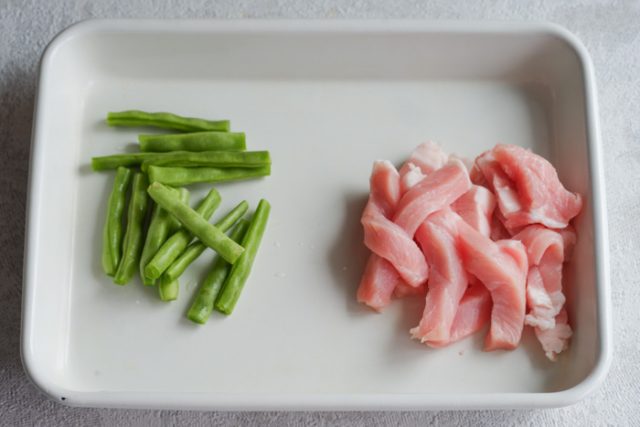 1.豚肉は1cm幅に、いんげんは5cm幅に切る。