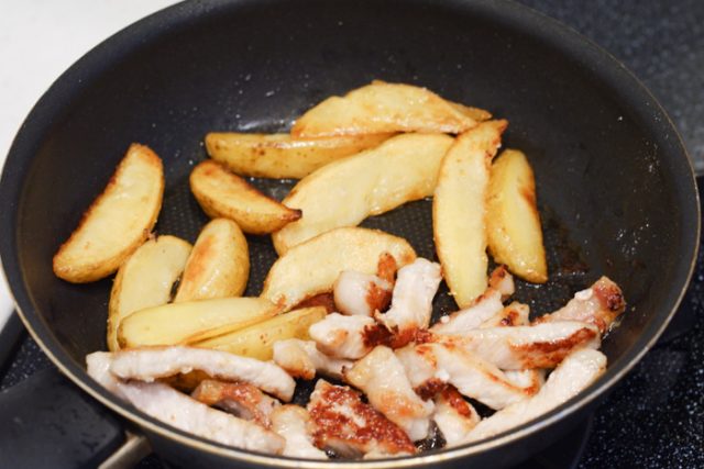 フライドポテトと豚肉を焼く際は、あまり動かさずに焼き目がついたら返すことで、カリカリに仕上がります。