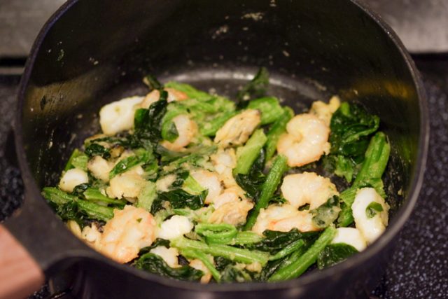 2.フライパンにバターを入れ、水気を切ったシーフードミックス、ほうれん草を加えて数分炒めたら、小麦粉を加えて粉気がなくなるまで炒める。