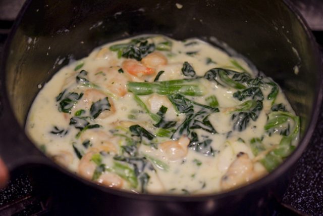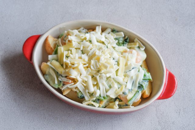 シーフードミックスやほうれん草を凍ったまま調理するとホワイトソースが水っぽくなってしまうため、時間がない場合は電子レンジで解凍し、しっかり水気を切ってから調理してください。