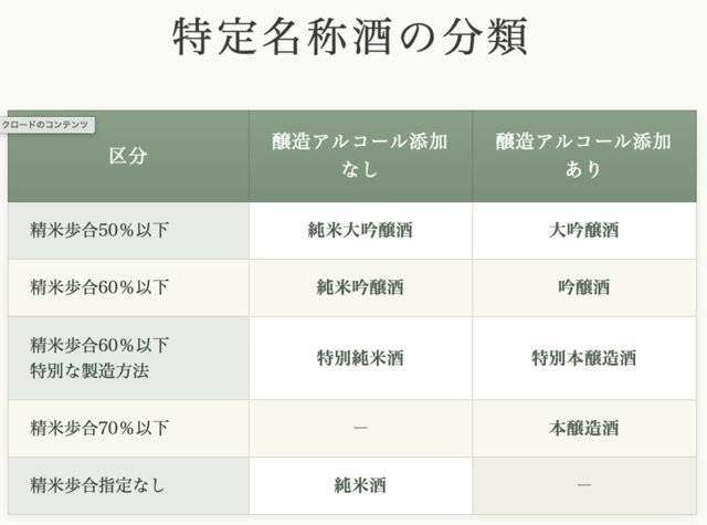 日本酒の種類は、酒税法によって明確に定義されています。日本酒の表示・分類は、国税庁の『清酒の製法品質表示基準』に基づき、「特定名称酒」と(それ以外の)「普通酒」に大別されます。