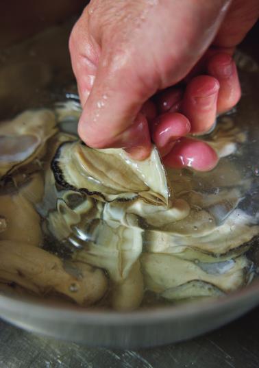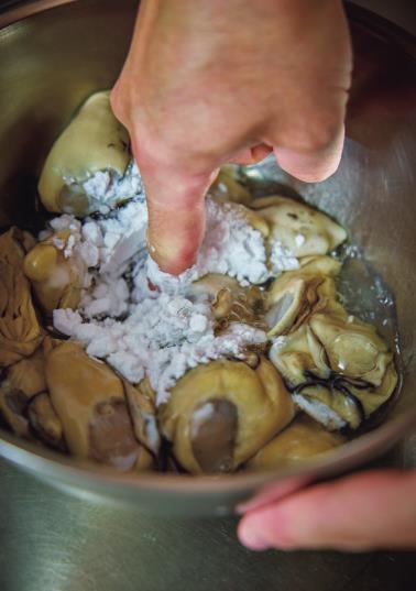 汚れを吸着しつつ、味を損なわない片栗粉を使う。ヒダに汚れがつきやすいので、ひとつずつ振り洗いをするとクリアな味わいに。