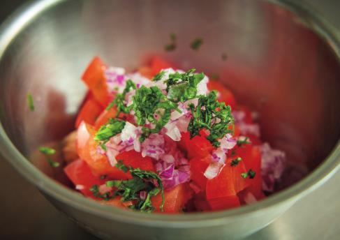 2.トマトは角切りにし、バジルと赤玉ねぎはみじん切りにしてボウルに入れる。
